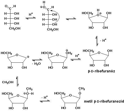 acetál (metil-béta-D-ribofuranozid) keletkezésének