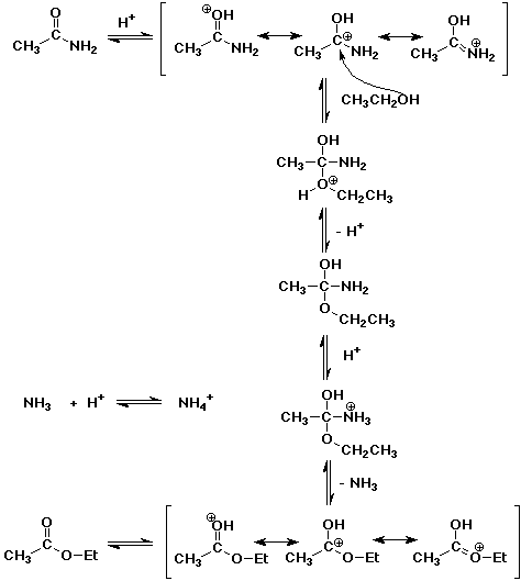 3. (5 pont) Írjuk fel az acetamid és az etanol savkatalizált reakciójának mechanizmusát.