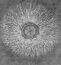| Georg Cristoph Lichtenberg (1742-1799) 1777-ben kezdett kísérletezni a Wilcke (1762), ill. Volta (1775) által feltalált, de saját javított konstrukciójú töltés- szétválasztó készülékkel; az elektrophorral. Ez az elektrosztatikus generátorok ôsének tekinthetô. Segítségével Lichtenberg 3040 cm hosszú, erôs "áramütést" okozó szikrákat tudott létrehozni. Lichtenberg egy sík felületû, megfelelô technológiával elkészített sima gyantafelületre egy sárgaréz csövet állított: a villamos szikrát ez a csô fogta fel. Lichtenberg reménye az volt, hogy ezekkel a kísérletekkel a "villamos anyag" mibenlétét tudja felfedezni. A szikrakisülés után a gyanta felületére finom likopódiumport szórt és így különleges rajzokat, a késôbb Lichtenberg- alakzatoknak nevezett ábrákat kapta. Valóban sikerült a kétféle töltésfajtát Lichtenberg nevezi ezeket elôször következetesen pozitív és negatív töltéseknek egyértelmûen hatásában megkülönböztetni. Az itt látható ábra pozitív töltés kisülése esetén jön létre. Ugyanilyen kísérleti körülmények között a negatív töltés jellegtelen, sötét, kör alakú foltot ad |