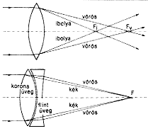 aberrációjának oka az, hogy egy anyag töresmutatója függ a fény hullám- hosszától: ez a színszórás, vagy diszperzió jelensége. A lencsére esô fehér fénynyaláb vörös összetevôjének tehát másutt lesz a fókusza, mint mondjuk a kéknek vagy az ibolyának. Ha azonban veszünk egy erôsen törô, de kis diszper- ziójú anyagból mint például a korona- üveg készült gyûjtótencsét és azt össze- kombináljuk egy kisebb törésmutatójú, de nagyobb diszperziójú anyagból mint amilyen a flintüveg készült szórólencsével, akkor legalábbis két színre elérhetjük, hogy fókuszuk egybeessék. Bonyolultabb lencserendszereket használva egyre töké- letesebb akromatikus, tehát színhibamentes leképzést lehet megvalósítani. Newton tévesen azt hitte, hogy egy anyag fénytörô képessége és diszperziós képessége arányos egymással. Így nem tartotta lehetségesnek, hogy két anyag közül a kisebb törésmu- tatójú nagyobb diszperzióval rendelkezzék. Az akromatikus lencsék megjelenését |