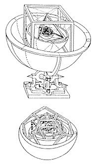 | Így képzelte Kepler a hat bolygó pályájának, valamint az öt szabályos testnek a kapcsolatát. Mindenek mértéke a Föld