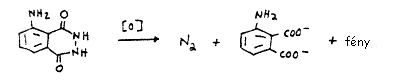 – Lyons olyan anyagot adott az ön szappanához, amelyik látható fényt bocsát ki, ha a fehérítõ oxidálja. Már régóta gyanakodtam erre a folyamatra. Lyons jól ismeri a nitrogéntartalmú heterociklusos vegyületeket. Úgy látszik, ismeri a kémiai lumineszcenciát és a szentjánosbogár titkát.2 Ezt az egyenletet láttam a papírjain: