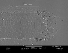 A 3. ábrán a 9000 Å rétegvastagságú SiO2 bevonat károsodásáról készült felvétel látható. Bár valószínűleg a karcvizsgáló berendezésen beállítható legkisebb terhelőerő (2N) túl nagy volt ennek a bevonatnak a vizsgálatához, a károsodási mechanizmus a felvételek alapján a gyenge adhéziós kötésre jellemző nagy kiterjedésű leválás-hoz (spalling) hasonlít a leginkább, melynél a bevonat leválását a szúrószerszám előtt kialakult nyomófeszültség okozza. A bevonat teljesen ridegen viselkedve vált le a lencséről, a lepattant darabok szintén jól láthatók a 3. ábrán.