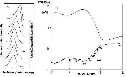 Ezen az ábrán a Si (111) 2 x 1 felületének fotoemissziós spektrumát mutatjuk be. Az egyes spektrumvonalakat különböző kilépési szögeknél vették fel. Ezekből a spektrumokból lehetett a b ábra diszperziós görbéjét előállítani.