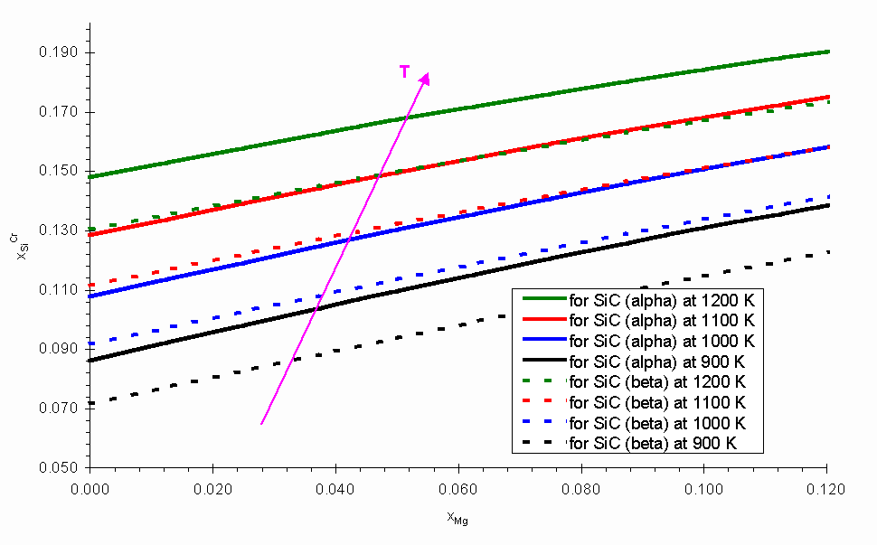 It can also be shown, that the maximum temperature of the process with a stable SiC/Al-Si-Mg interface can be found at xMg = 0, and equals the maximum temperature found above for the binary Al-Si. The lowest values of the maximum temperatures allowed for the stable interface can be found from the intersection of the critical Si-content curve by the ternary eutectic point. It has been found 990 K (= 717 oC) for a -SiC and 1074 K (801 oC) for b -SiC. In other words, if the concentration of Mg is increased from xMg = 0 to 0.051 [35-37], and the Si-content is changed along the eutectic valley from xSi = 0.122 to xSi = 0.126 [35-37], the possible temperature range interval changes as follows: