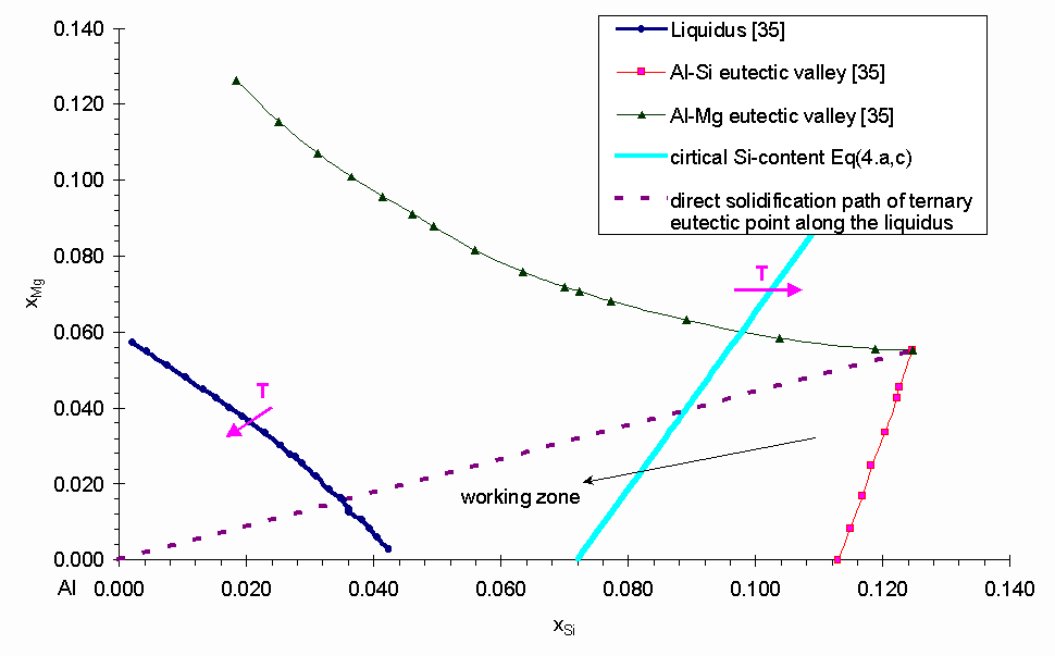 The ‘working zone’ to ensure stable SiC/Al-Si-Mg interface is situated above the Si-content described by Eqs(4.a-c). On the other hand, the working zone is limited by the liquidus surface in the ternary Al-Si-Mg system (the working temperature should be above), by the eutectic valley starting from the binary Al-Si eutectic points, and leading to the ternary Al-Si-Mg eutectic point, and also by the solidification path along the liquidus, leading from the ternary eutectic point to pure Al-corner of the diagram. An example of a ‘working zone’ is shown in a 903 K isothermal section of the ternary Al-Si-Mg phase diagram in Fig-s.5.a-b. The data concerning the eutectic valleys, binary and ternary eutectic points were taken from [35, 36, 37].