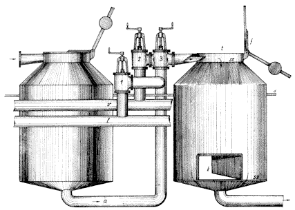 Diffuzôrök vázlata; a bal oldali elölnézetben, a jobb oldali metszetben: a=átvezetô csô, d=deszkapadló, f=fedô ellensúllyal, k=kieresztô ajtó, I=lévezeték, sz=sziták, t=töltônyílás, v=nyomóvízvezeték, 1, 2, 3=szelepek. A lé a szelettel töltött egyik edénybôl a másikba a vezetéken és a 3. szelepen át áramlik. A legjobban kilúgozott szeletre a nyomóvíz a v vezetékbôl a 2. szelepen át jut. A nyerslé az édes szeletrôl a vezetéken, lezárt 3. és nyitott 1. szelepállás mellett kerül a vezetékbe, amelyen át a diffúziós telepet elhagyja. Jobb áttekinthetôség céljából elhagytuk a légkieresztô, nyomáskiegyenlítô, gôzszabályozó és öblítôszelepeket, valamint a gôz- és öblítôvíz-vezetéket.