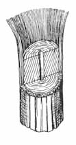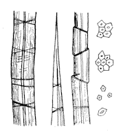 83. kép. A szár rostjai. 84. kép. A len mikroszkópi képe. A len közeli rokona a kender, melynek durvább rostjai még tisztított állapotban is majdnem mindig adják a lignin reakciót. Nemcsak a háziipar nyersanyaga, hanem sokat dolgoznak fel kötél- és zsákárúvá is.