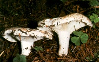 A földtoló galambgomba (Russula delica) nagy termetû, többnyire tölcsér alakú, fehéres színû gomba. A talajban vagy az avarban kezd fejlôdni, maga elôtt tolva a földet vagy az avart, ezért a kalapja mindig "piszkos". Lemezei érintkezési helyén a tönk kékeszöld árnyalatú. Ehetô, de nem jóízû. |