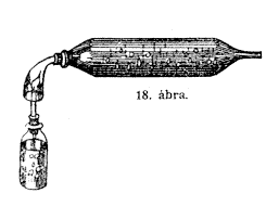 Itt van ez az olvasztókemence, melyen vascsô, egy puskacsô fut keresztül; e csövet tiszta vasreszelékkel telitömtem és alájagyújtottam, hogy a vasreszelék izzóvá tüzesedjék. A csövôn vagy levegôt bocsáthatunk keresztül, hogy a vasreszelékkel érintkezhessék, vagy pedig e kis fôzôedénybõl, mely a csô végével összeköttetésben van, vízgôzt ereszthetünk bele. Ez a csap a gôzt mindaddig elzárja, míg csak nem akarjuk