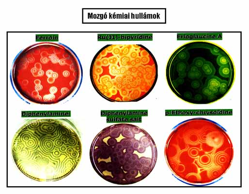 A BZ rendszernek, sokoldalúsága ellenére hibája is van: a reakció végterméke CO2 gáz, ami zavarja a kémiai mintázatok kifejlődését, ezáltal azok időbeni tanulmányozását. Kerestük és az utóbbi években meg is találtuk a mintázatképződés tanulmányozására a BZ-nél alkalmasabb variánsokat. A zárt rendszerben is működő BrO3- - Ciklohexándion - Indikátor és a BrO3- - H2PO2- - Aceton – Mn(II)/Ru(II) összetételű oszcillátorainkban buborékmentes, több órán át is fennmaradó kémiai hullámok állíthatók elő.11 A 10. ábrán láthatók a CHD szubsztrátos BrO3- oszcillátorban a különböző indikátorok illetve katalizátorok jelenlétében kialakuló kémiai hullámok.