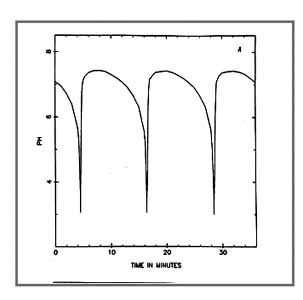 A pH oszcillátorokban a sorozatos vagy párhuzamos kémiai reakciók által bekövetkező pH változások idézik elő azokat a (+) és (-) visszacsatolásokat, amelyek az oszcillációs ciklust kialakítják. A pH oszcillációja tehát nem következménye, hanem hajtóereje az oszcillációs kinetikának. A pH oszcillátorokban a pH akár 3–4 egységet is változhat egy oszcillációs ciklusban. A 18. ábrán példaként bemutatom a IO3- - SO32- - Fe(CN)64-rendszerben regisztrált pH oszcillációkat.