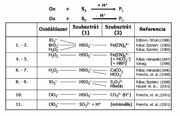 Egy pH oszcillátor 2 lényeges részreakciót tartalmaz: az egyik H+ termelő autokatalitikus reakció, a másik H+ fogyasztó folyamat. Oszcilláció a pH-ban akkor áll elő, ha a részreakciók időben elkülönülve játszódnak le. A két részreakció megvalósítható egy szubsztráttal, annak részleges, majd teljes oxidációjával, vagy két különböző szubsztráttal. Az egy-szubsztrátos változatok száma 6, ezekben a redukálószer kén és nitrogén vegyület, az oxidálószer H2O2, IO3- vagy IO4- (19. ábra). A két-szubsztrátosok száma 11. Itt a H+-termelő folyamat a SO32- oxidációja kénsavvá, a H+-fogyasztó lépés a másik szubsztráttal történő reakció (20. ábra). Mindkét típusú pH oszcillátor első képviselőit laboratóriumunk állította elő.