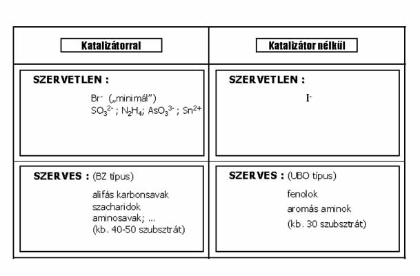A 9. ábrán a különböző variánsokat mutatom be. A katalizátor és a szubsztrátvariálható. Az alkalmazható szubsztrátok száma kb. 80-90. Ezek között sok szervetlen és még több szerves vegyület található. A szervetlen szubsztrátú BrO3- oszcillátorok (egy kivétellel) csak nyílt rendszerben, a szerves szubsztrátumúak zárt rendszerben is oszcillálnak. A variánsok 70 %-a csak katalizátorral (BZ rendszerek), kb. 30 %-a katalizátor nélkül is (UBO rendszerek) működik. (Az ábrán bekereteztük a saját előállítású rendszereket, amelyek a variánsok kb. felét teszi ki).