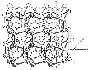 Ilyen volt az 5.ábrán látható a folyadék egész térfogatára kiterjedõ rácsmodell. A rácsból kiszakadt és a jégrács csatornáiban elhelyezkedõ vízmolekulák, az u.n. rácsközi vízmolekulák és a hibahelyek jelentették a rendezetlenség megjelenését a modellben. Ilyenek voltak a klasztermodellek is, amelyekben a végsõe méretû néhányszáz molekulára kiterjedõ, a jég valamely módosulatának szimmetriájával rendelkezõ, klaszterek közötti, elszakadt hidrogénkötések és a klaszterek felületéhez közel elhelyezkedõ molekulák csökkenõ hosszú távú rendezettsége jelentette a rendezetlenség megjelenését a vízben.