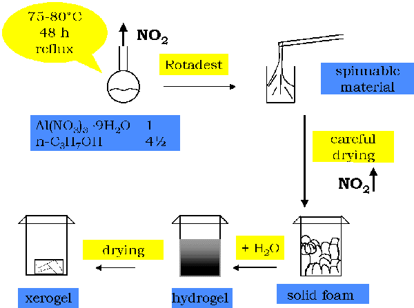 By reacting Al(NO3)3·9H2O with 1-propanol excellently spinnable material as well as bulk elastic gel and xerogel were produced directly without time-consuming sol preparation and peptisation step (Fig 1.). During the preparation process the 70% of the nitrate ions is removed, thus a washing step is not needed. I determined the optimal parameters (time and temperature of the reaction, the composition of the reaction mixture, the drying method) to obtain the smallest nitrate/Al(III) mole ratio without precipitation. Table 1 contains the chemical composition of the products.