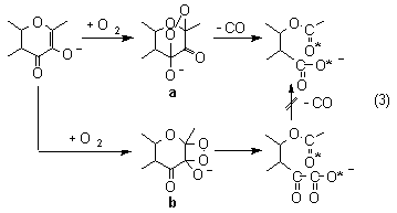 Oxygenation of potassium and zinc flavonolates in DMF lead to the corresponding O-benzoylsalicylate and carbon monoxide. Kinetic measurements resulted in the rate law -d[fla-]/dt = k[fla-][O2]. The second order rate expression suggest that the rate-determining step is the reaction between the flavonolate ion and dioxygen forming flavonoxy radical and superoxide ion (equation 6).