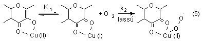 A redoxaktív fémtartalmú komplexek (Cu(I), Cu(II)) oxigénezési reakcióiban - a reakciókinetikai mérések eredményei alapján - a sebességmeghatározó lépéseket tekintve két esetet különböztethetünk meg. A réz(I)tartalmú vegyületek esetében a réz(I)komplexek közvetlen oxidációja (4),