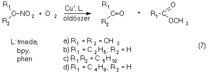 Megmutattuk, hogy az elemi réz aprotikus oldószerben (DMF, Py), nitrogén donoratomokat tartalmazó ligandumok (phen, bpy, tmeda) jelenlétében katalizálja a nitrovegyületek oxigénezését a megfelelõ karbonilvegyületté (7).