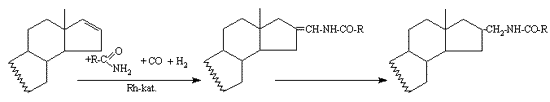 2. New steroid derivatives containing free function group have been produced in a multi-step, rhodium-catalysed hydroaminomethylation reaction. Using in situ rhodium complexes the hydroxy-aminomethyl derivatives have been obtained in moderate to good yield by carbonylation of several D16 androstane and pregnane in the presence of aminoalcohols.