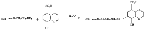 Elõállítottunk egy új típusú, 8-hidroxikinolin-5-szulfon–sav-csoportokat tartalmazó cellulózt (szulfoxin-cellulózt), Mannich reakcióval, Whatmann cellulózporból, klórdezoxi-cellulózon és etiléndiamin-cellulózon keresztül [ 2] . (ld. angol szöveg: Scheme)