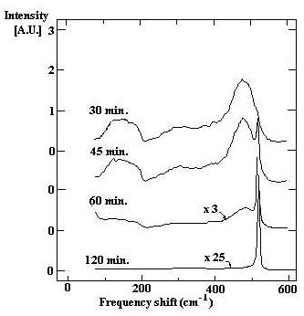 A 6.32. ábra CVD szilícium Raman-spetruma a 600 Co-os hőkezelés okozta változásokat mutatja. Az amorf szilícium hőkezelése során a különböző hőkezelési időtartamot követően felvett spektrumok egyre növekvő mennyiségű kristályos szilícium jelenlétére utalnak.